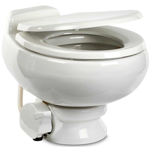 This ceramic gravity discharge toilet features a contemporary European design with a deeper, low-profile bowl for compact installation. It includes a solid wood seat with an elongated opening for added support. The toilet uses minimal water, requiring just 1/2 liter per flush, and the foot pedal adds water easily. The improved rim design enhances cleaning and prevents spills. It fits all standard plumbing, offering a durable, commercial-grade build. It's easy to service with readily available parts, and the domestic-sized bowl provides comfort.