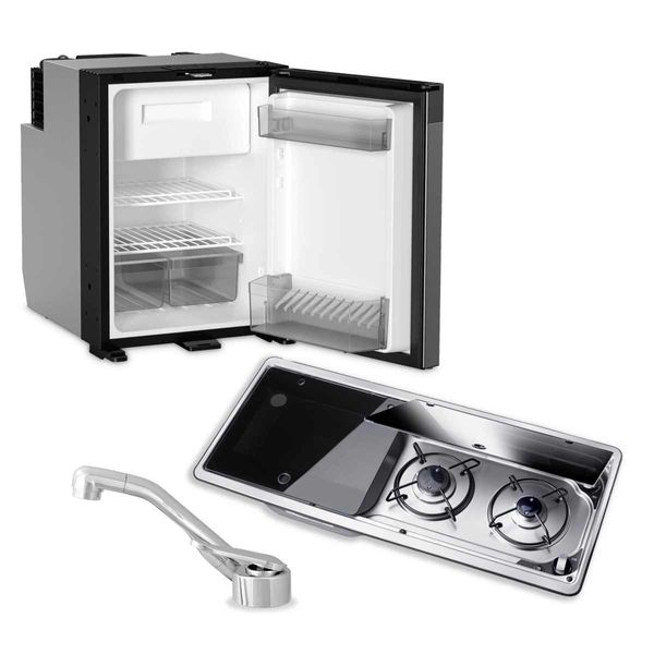 Designed specifically for campervan conversions, this premium bundle includes a Dometic NRX50 compressor fridge, a combination unit with a double gas hob on the left side and a sink on the left, plus a high-quality single-lever cold water tap.