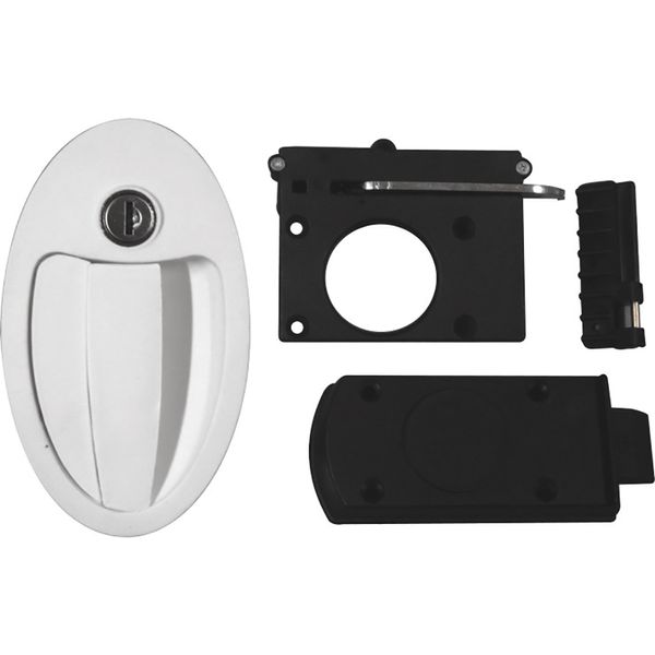 Flap Lock "Fish" with Hook - 1203KIT1028N: A popular lock system frequently used on motorhomes. Supplied with the FAP new system barrel and two keys. Available in versions with or without security features.