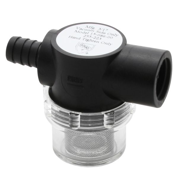 Keeps debris out of pump, transparent, easy to see when strainer needs cleaning, 50 Mesh stainless steel screen. Port Size : 1/2" Twist-on fitting, 1/2" Hosetail outlet.